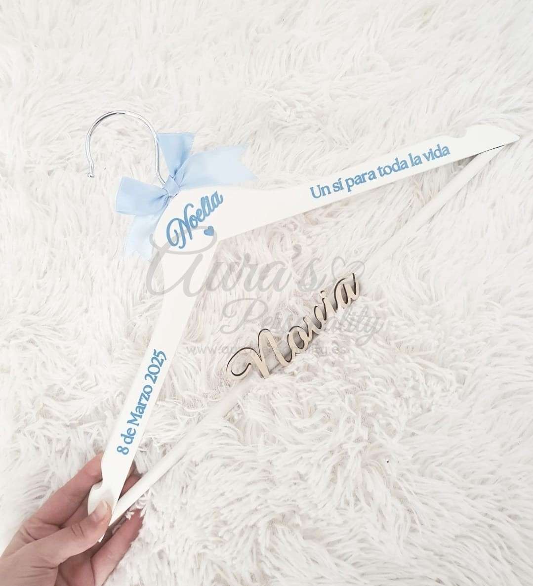 Perchas Personalizadas de Aura’s Personality son el complemento perfecto para las fotos de tu traje de novio y vestido de novia, asegurando que cada recuerdo sea único.
