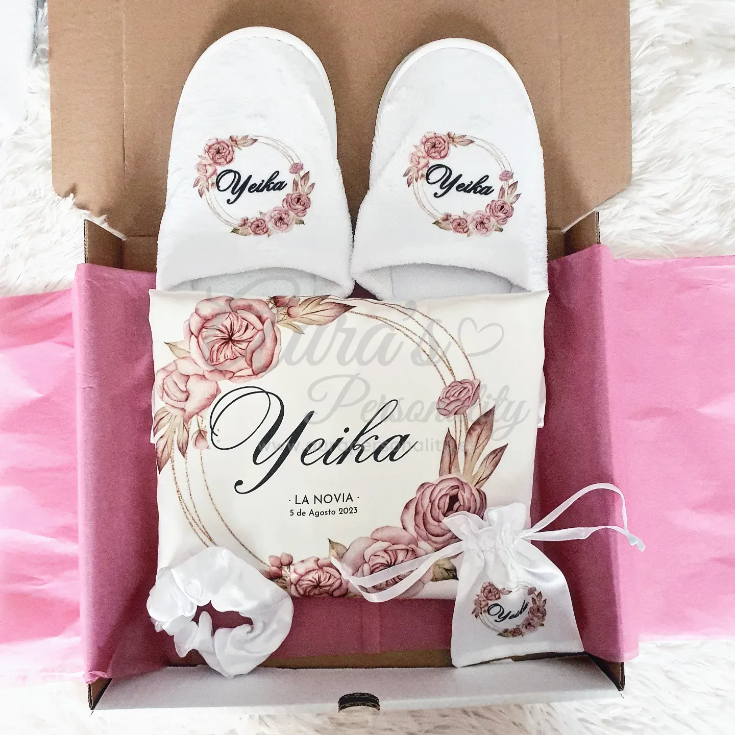 Pack Bata de novia personalizada floral rosa con zapatillas – promo