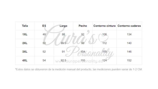 Tallaje: Nuestras tallas son las habituales. No obstante, si tienes dudas por tener mucho pecho o cadera, te recomendamos elegir una talla superior.
