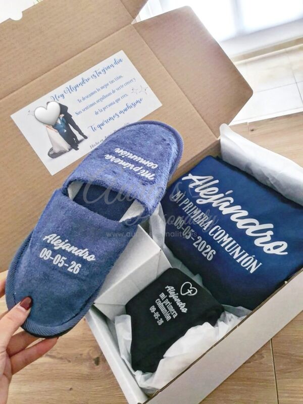 En Aura’s Personality, sabemos que ellos también quieren sentirse especiales en su Primera Comunión. Por eso, hemos creado este set de regalo personalizado para niños, una propuesta de lujo que cuida cada detalle del despertar del protagonista. Este kit de comunión masculino es la pieza clave para un reportaje de fotos inolvidable, combinando la distinción de una bata de comunión para niño o un pijama personalizado con accesorios que derrochan estilo.