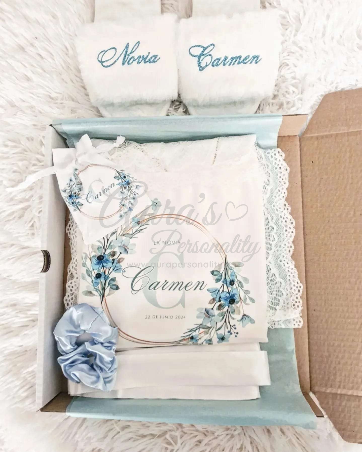 Pack bata de novia personalizada lisa floral con pijama zapatillas y liga